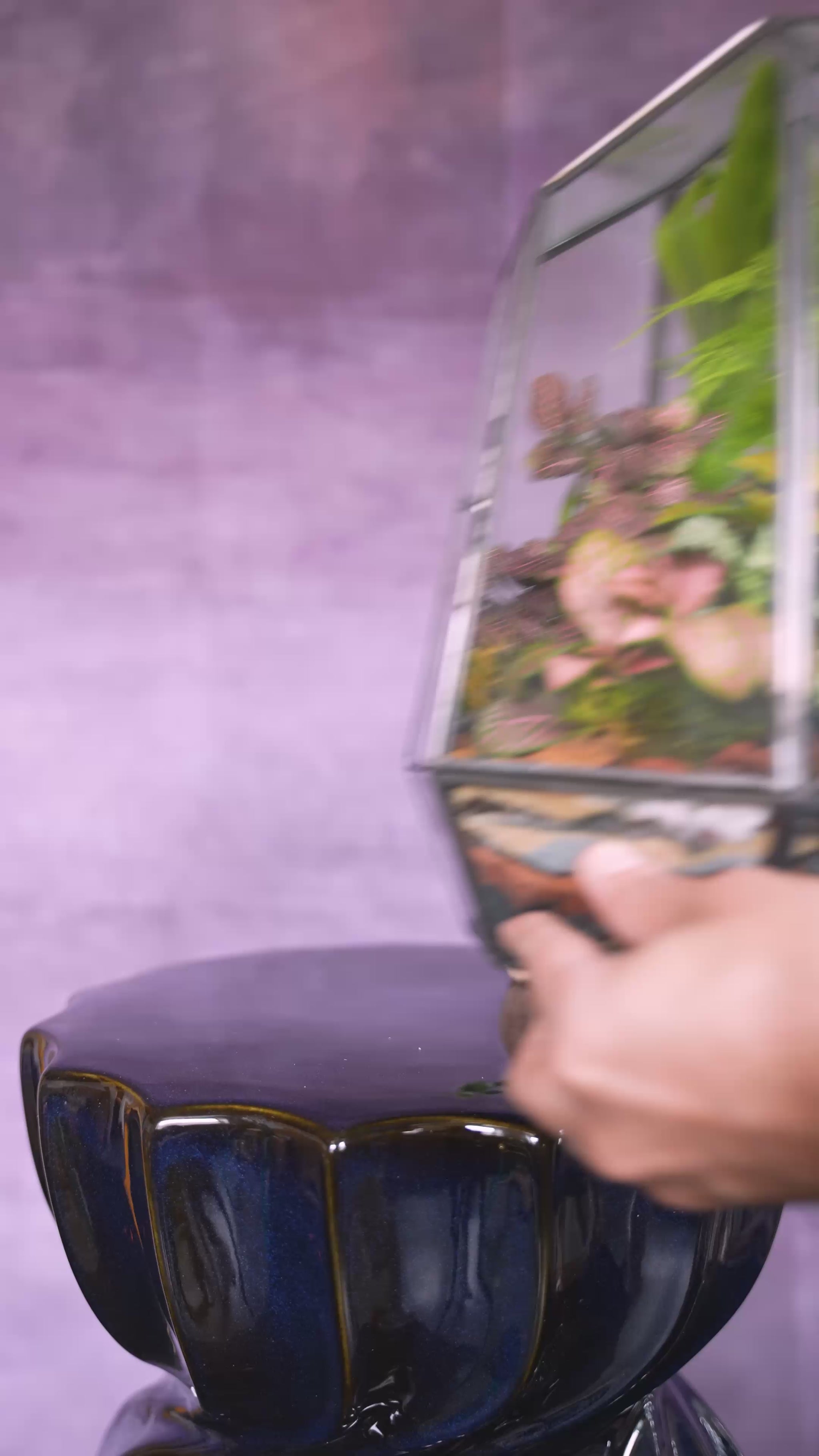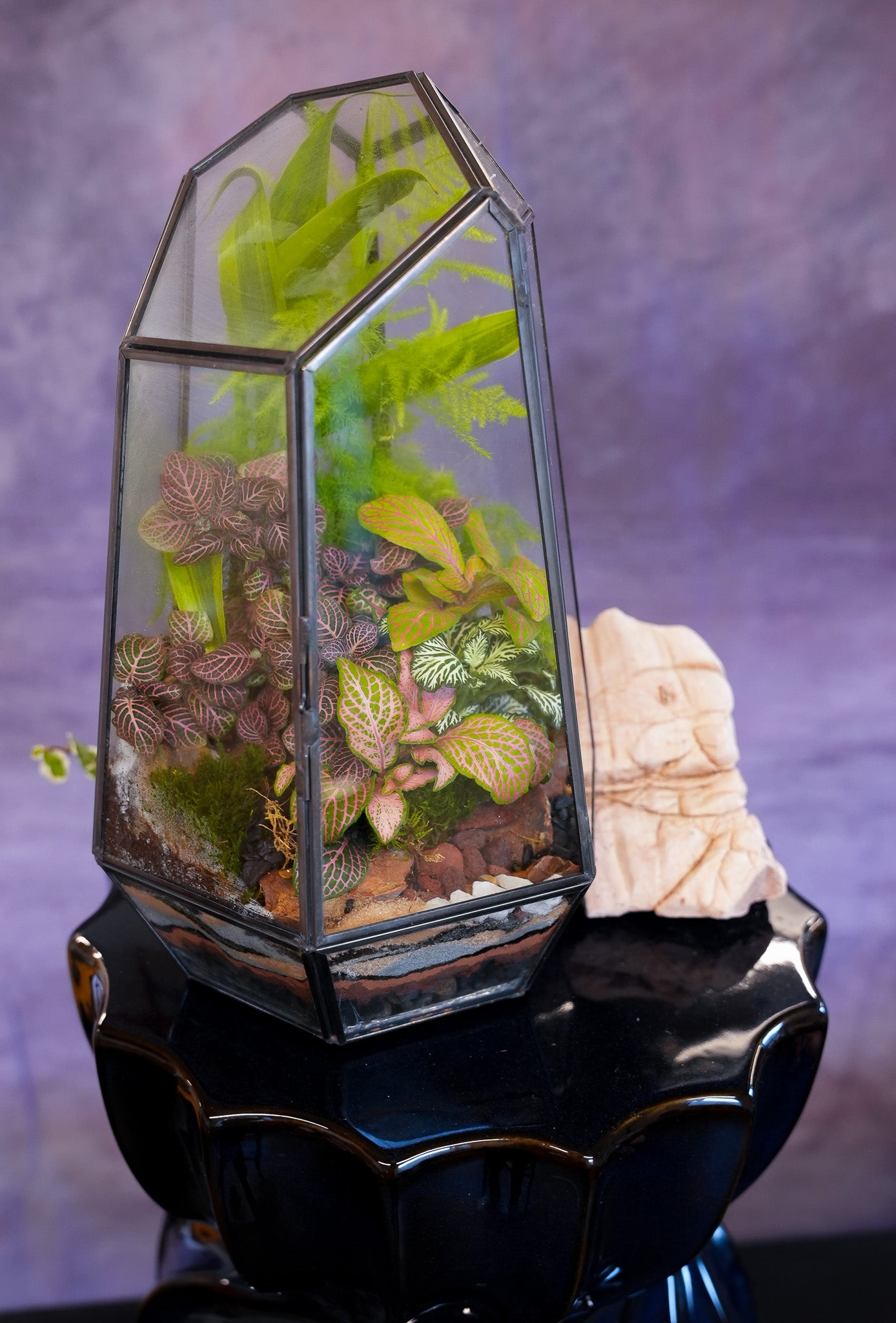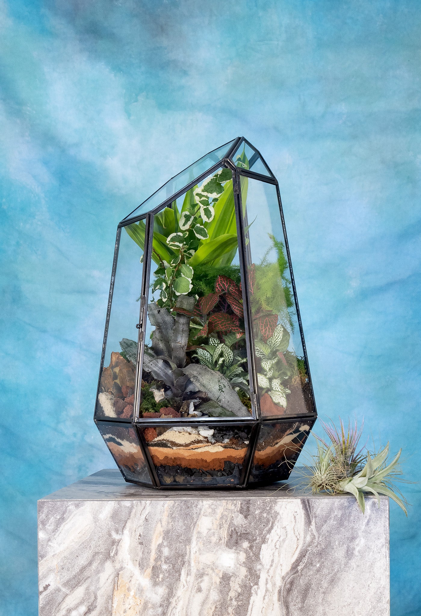 The compact size of this terrarium makes it perfect for display on a windowsill, tabletop, or shelf. Whether you're looking for a stunning centerpiece for your home or office, or a special gift for a loved one, this irregular prism terrarium is sure to impress and delight.