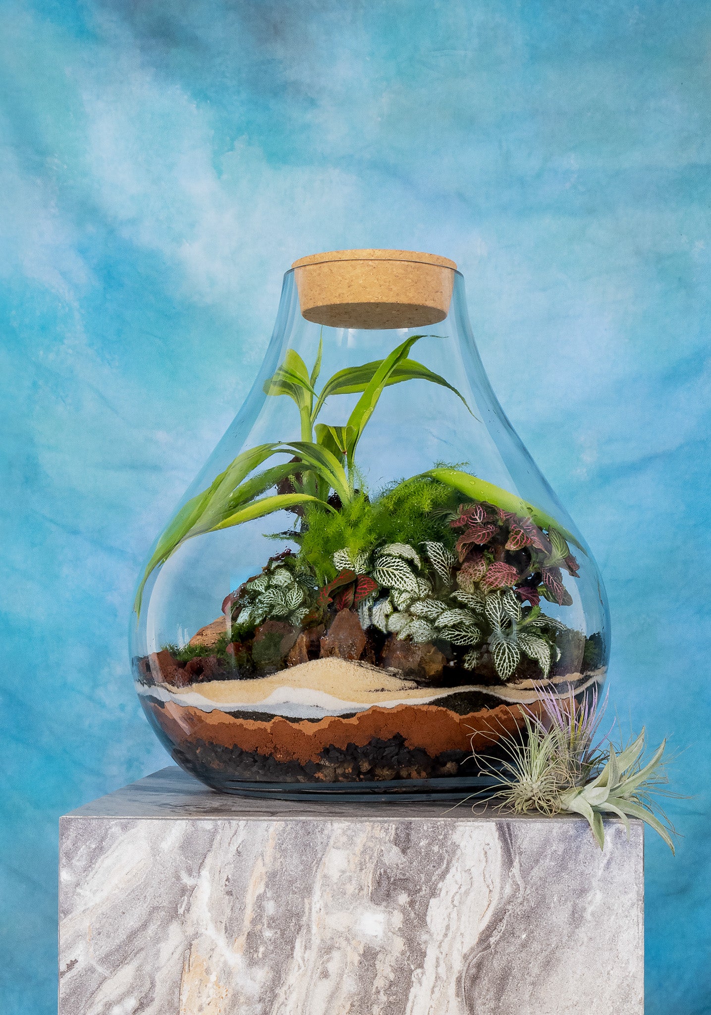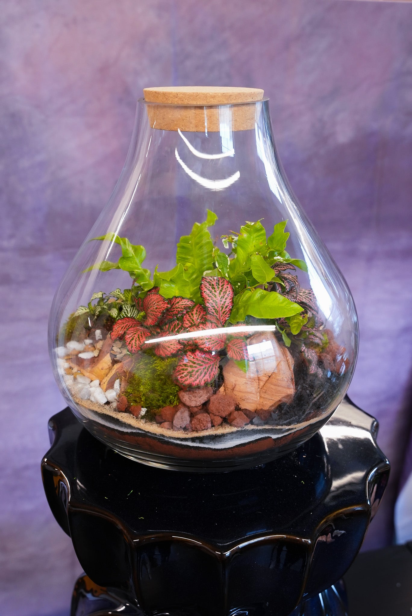 A bell-shaped glass vase with an exuberant landscape, a perfect centerpiece for living room or dining area. The wide base tapers to a small mouth with a cork stopper, holding a lush jungle of fittonias and ferns.